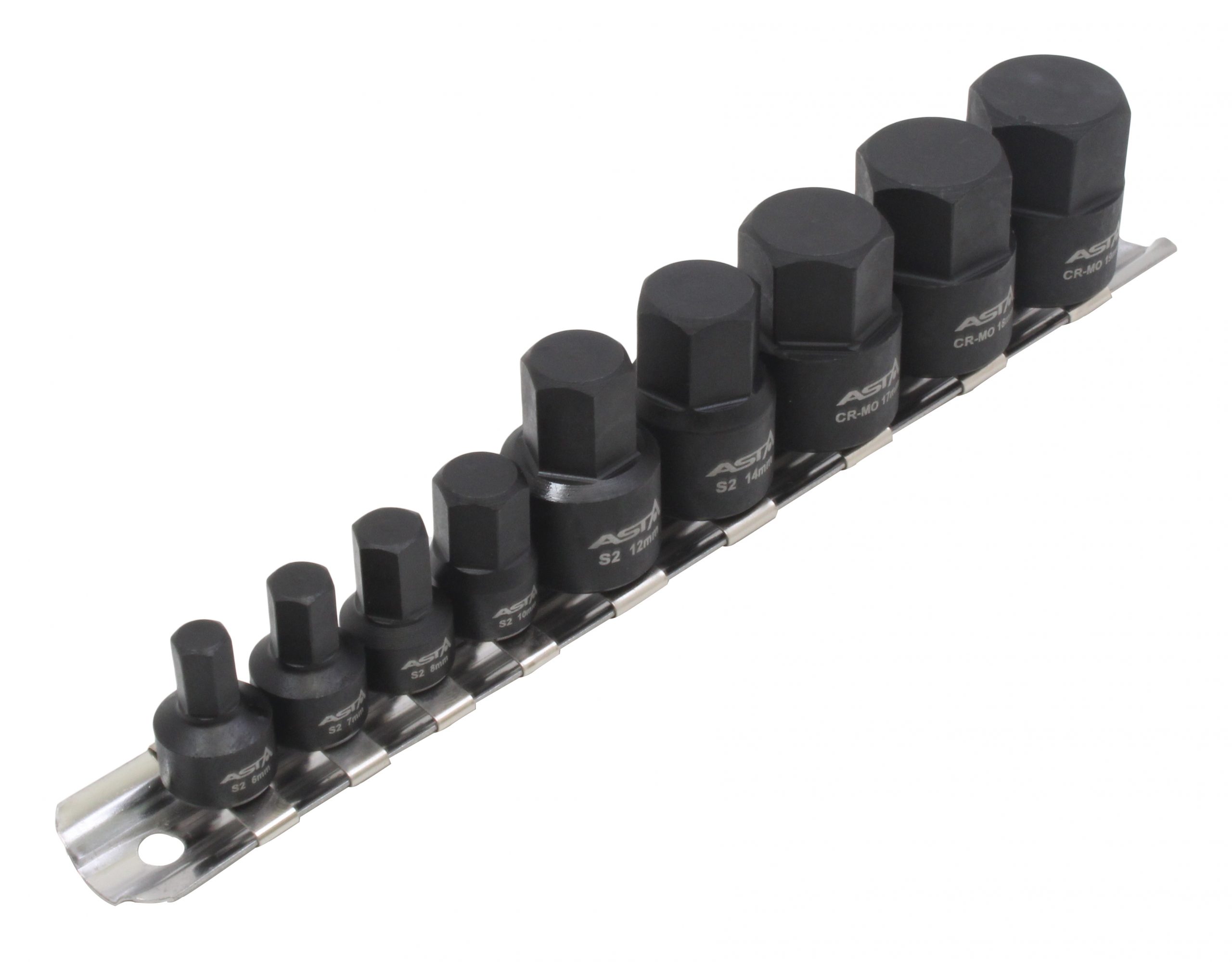 - Zestaw zawiera 9 różnych nasadek udarowych 1/4″ oraz 3/8” na metalowej szynie.