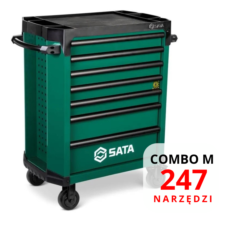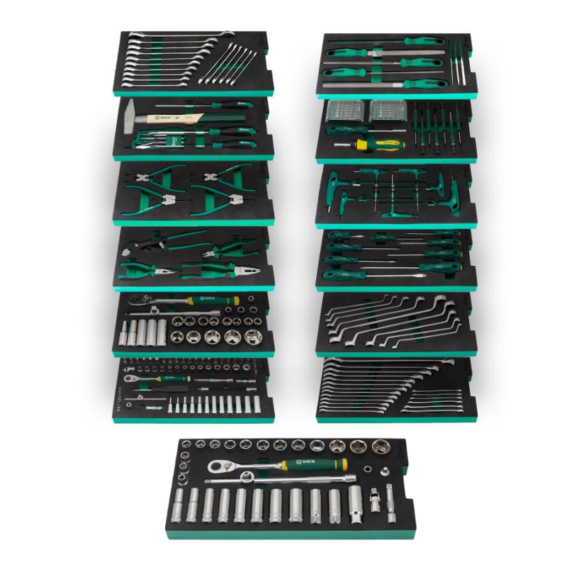 Zestaw obejmuje wózek narzędziowy firmy Sata z siedmioma szufladami oraz komplet wkładek piankowych EVA z uporządkowanym zestawem narzędzi ręcznych i akcesoriów. Wkładki dopasowane są wymiarowo do szuflad, co umożliwia stałe rozmieszczenie narzędzi i łatwą identyfikację braków. Gwarancja dożywotnia na produkty firmy Sata zakupione u nas w firmie!