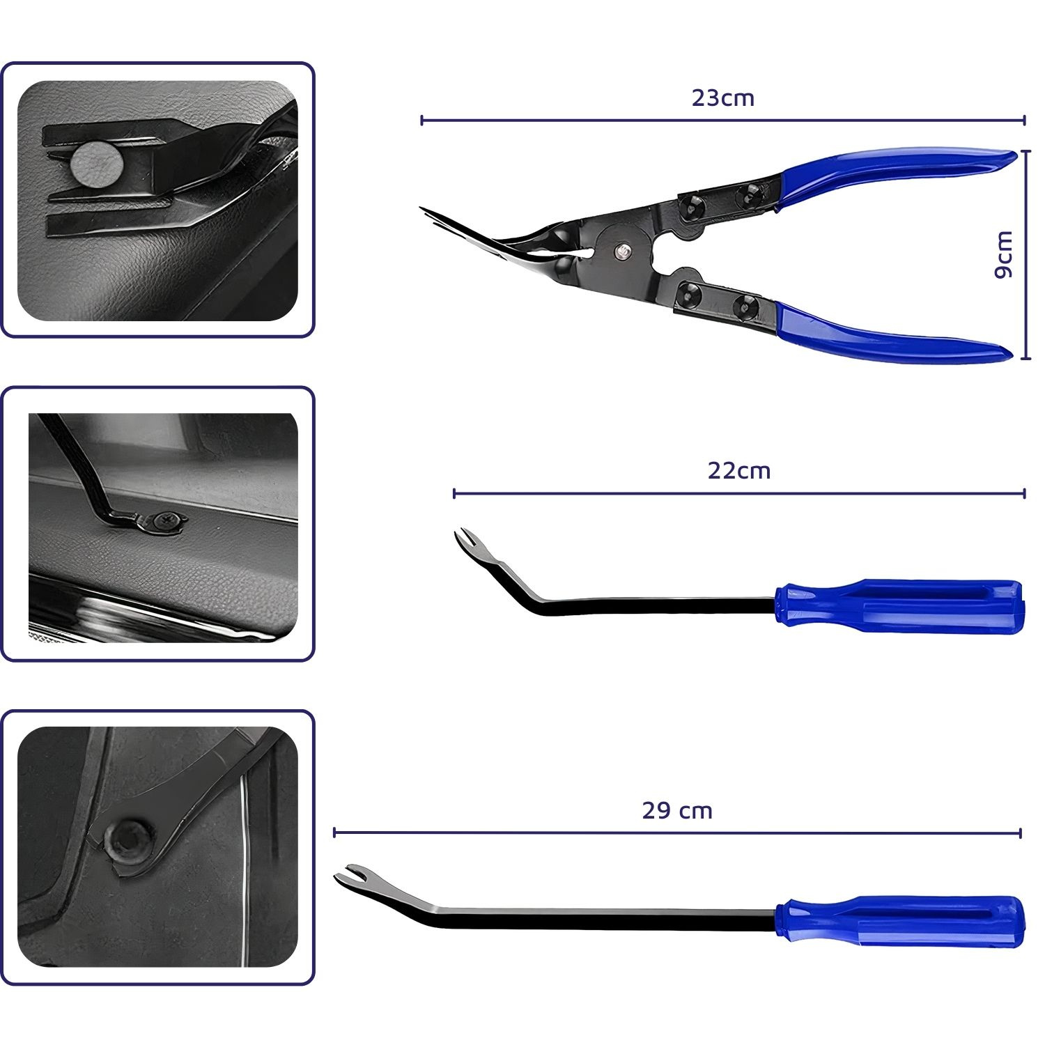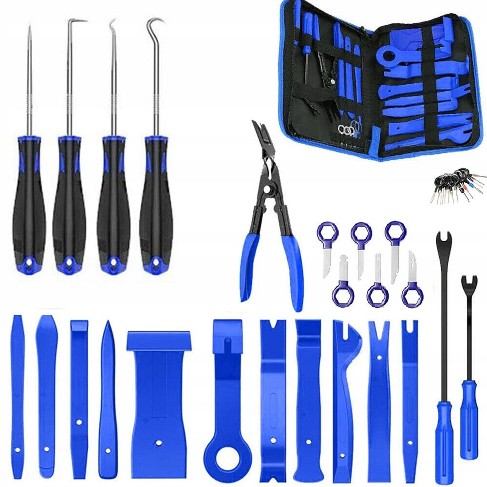 Ściągacze do tapicerki i listew samochodowych – zestaw 43 elementy to profesjonalny komplet narzędzi przeznaczony do demontażu tapicerki, listew, paneli oraz spinek samochodowych.