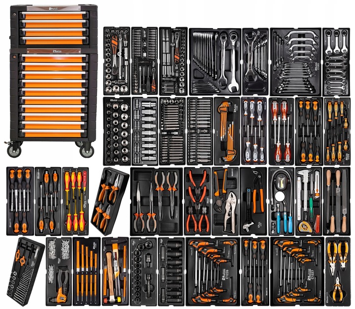 • Wyposażony w kółka, dzięki którym z łatwością można przemieszczać zestaw po warsztacie. Dodatkowo posiada blokadę dostępu dzięki zamknięciu wszystkich szuflad na kluczyk.