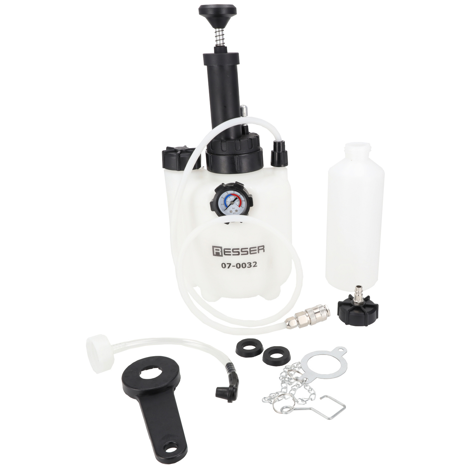 Zestaw pompa do odpowietrzania i wymiany płynu hamulcowego z adapterami – profesjonalny zestaw umożliwiający szybką i wygodną obsługę układów hamulcowych oraz sprzęgłowych w samochodach osobowych, dostawczych i motocyklach 07-0032