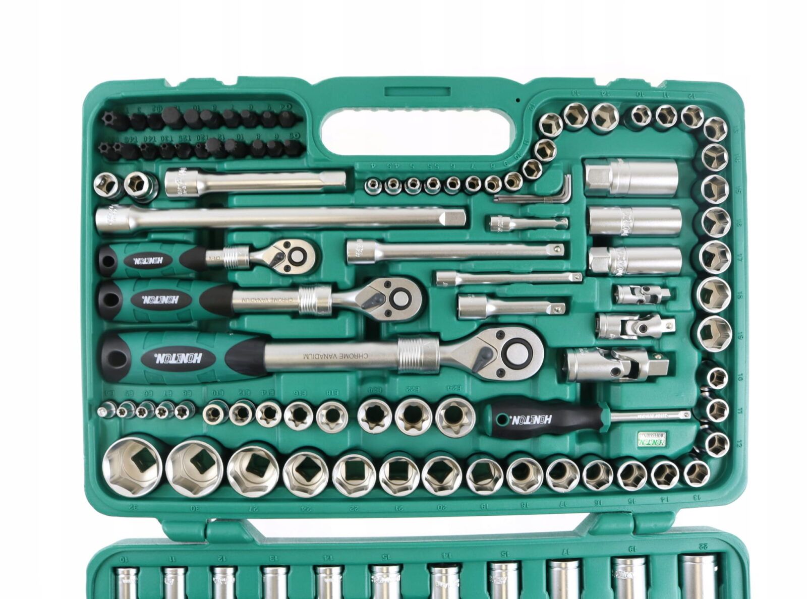 Oryginalny zestaw kluczy nasadowych HONITON. Nasadki bardzo wysokiej jakości wykonane z stali chromo-wanadowej gwarantującej ich wysoką wytrzymałość! Zestaw składa się z 155 nasadek, całość zapakowana w praktyczną walizkę.